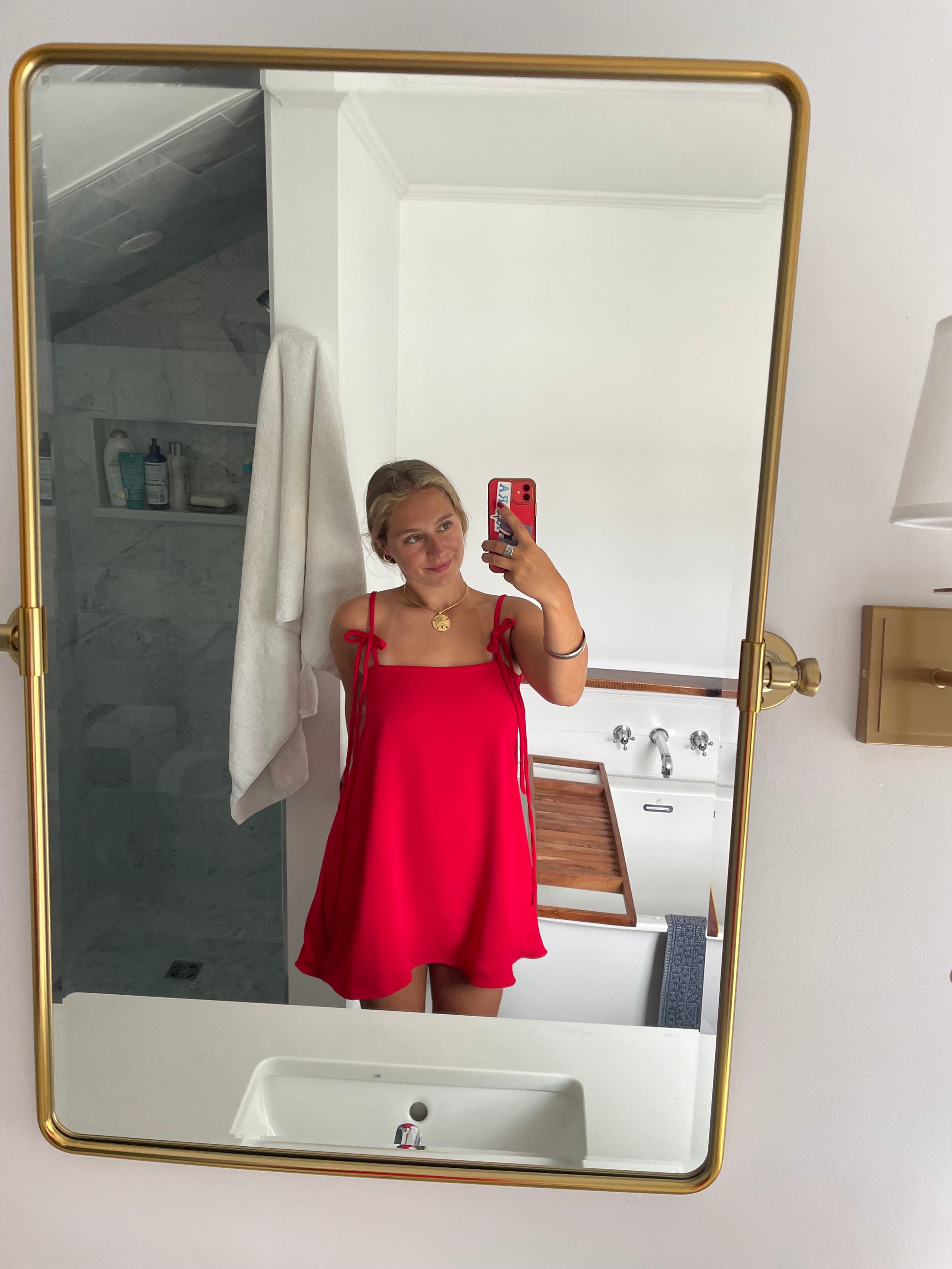 Mini babydoll style dress in red with adjustable straps that tie into a bow. The front side has a curved neckline and the back is straight across (can be worn backwards).